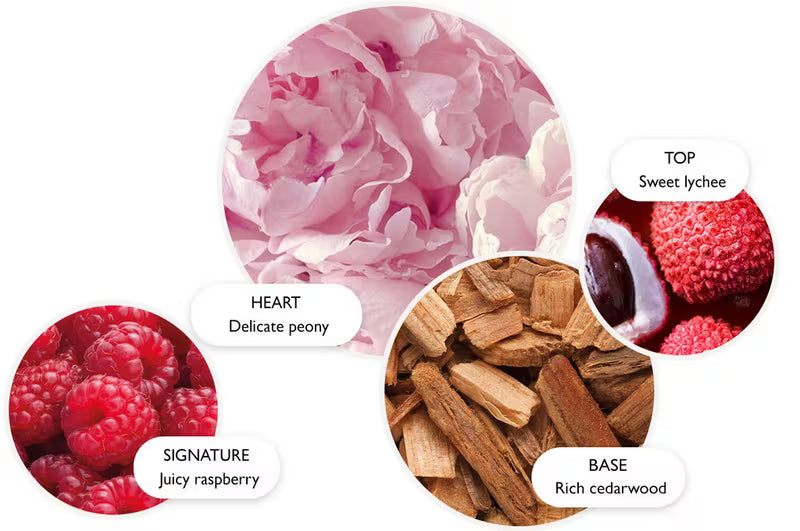 An irresistible Eau de Parfum with a tempting recipe of sweet lychee, delicate peony and rich cedarwood. A signature note of juicy raspberry brings out the joyful, sparkling nature of this sophisticated fragrance – the perfect complement for warm-hearted and grounded personalities.