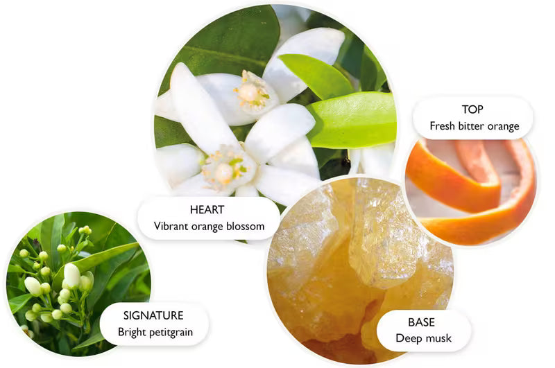 A celebration of joy and energy; this Eau de Parfum captures blooming orange flowers at their most exuberant, with a creamy floral depth of ylang-ylang in the heart and finished with the earthy sensuality of musky-woods.