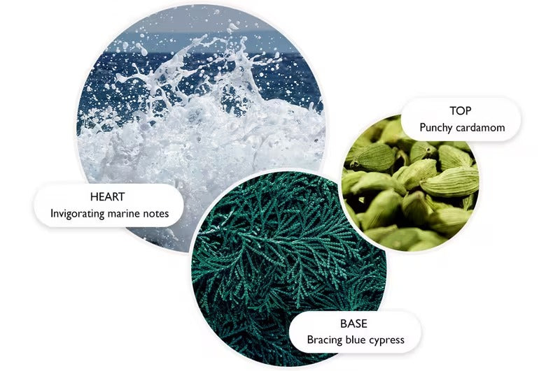 Immerse yourself in the uncharted freshness of our ocean-inspired Eau de Parfum. Opening with aromatic fig leaves and ginger with cypress and jasmine in the heart, the fragrance has an opulent leather and musk base.