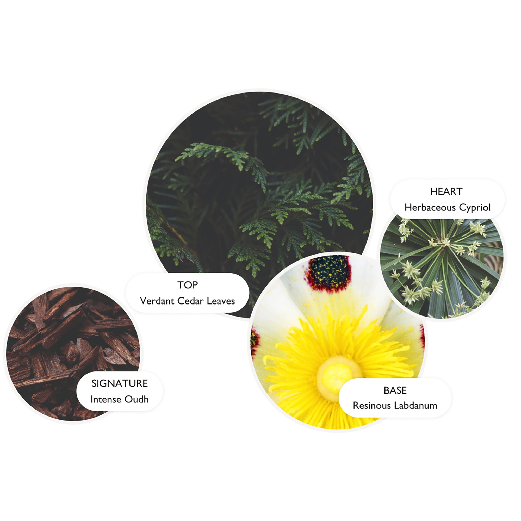 A treasurable ambery-woody Eau de Parfum, with a majestic foliage of contemporary cedar leaves at the top and rich spirals of patchouli in the heart. A signature note of rare oudh forms an exquisite union with labdanum in the base, deepening the scent trail and creating an undeniable aura – for lovers of five-star decadence.