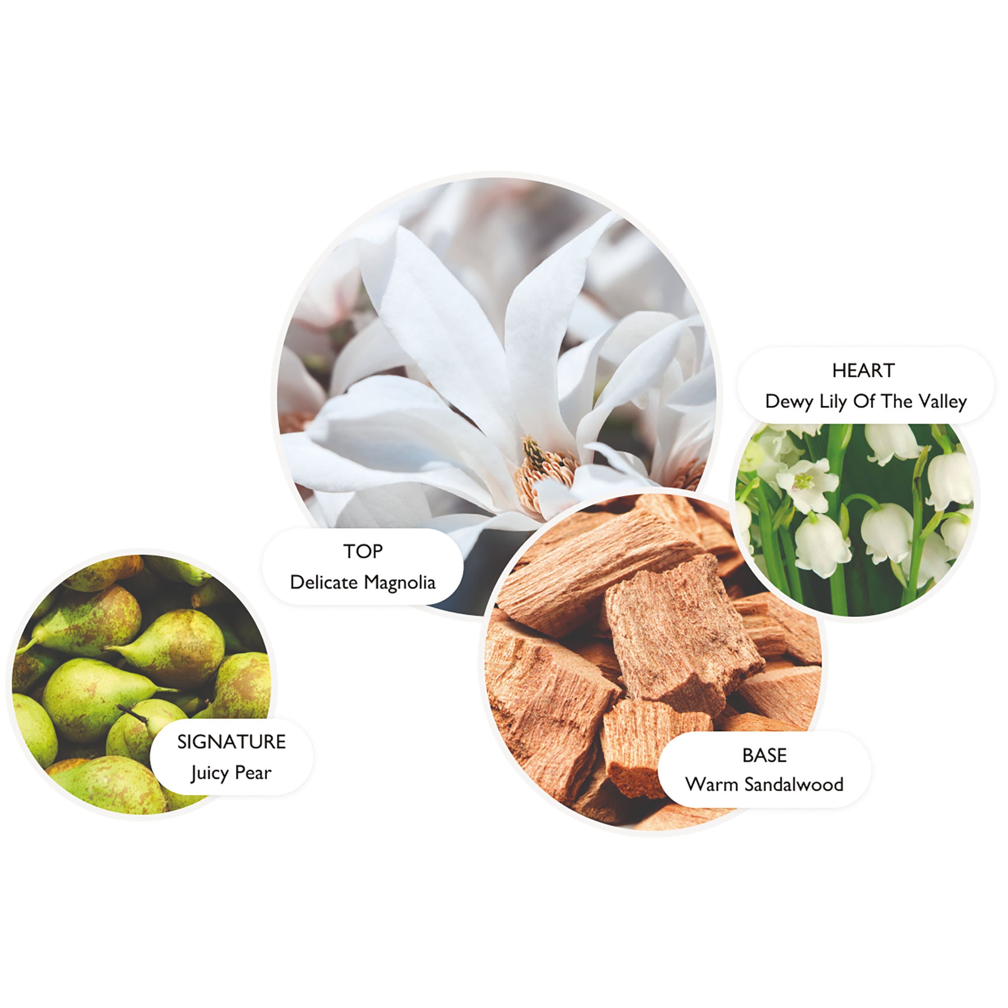 A joyful floral fragrance, Lily & Magnolia Eau de Parfum is an ode to Cornish woodlands, blooming with creamy magnolia, dewy lily of the valley and warm sandalwood. Juicy pear – its signature note – accentuates the scent's top notes and lends a sweet, long-lasting trail.
